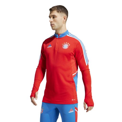 De adidas Bayern München trainingstrui heeft een standaard pasvorm. Met de korte rits kan je de pasvorm zelf aanpassen naar wens. De duimgaten in de boorden zorgen voor een gestroomlijnde look. Zo kan jij je volledig concentreren op het spel.